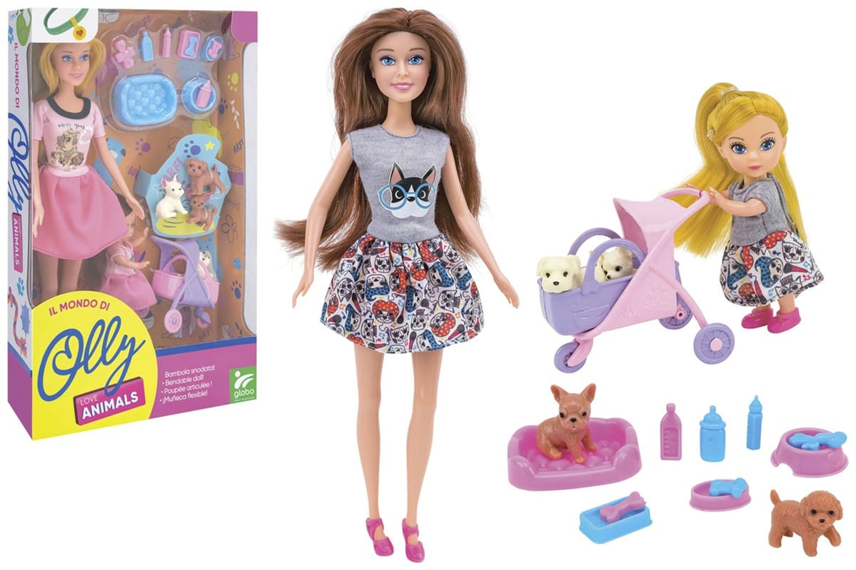 MUÑECA CON MINI MUÑECA Y 4 PERROS